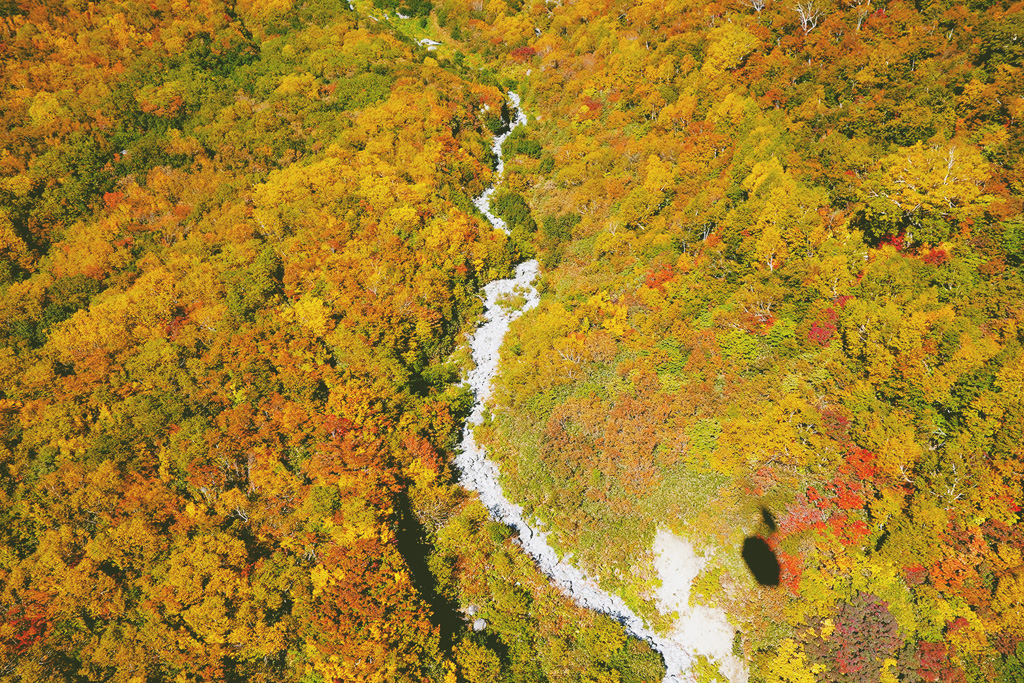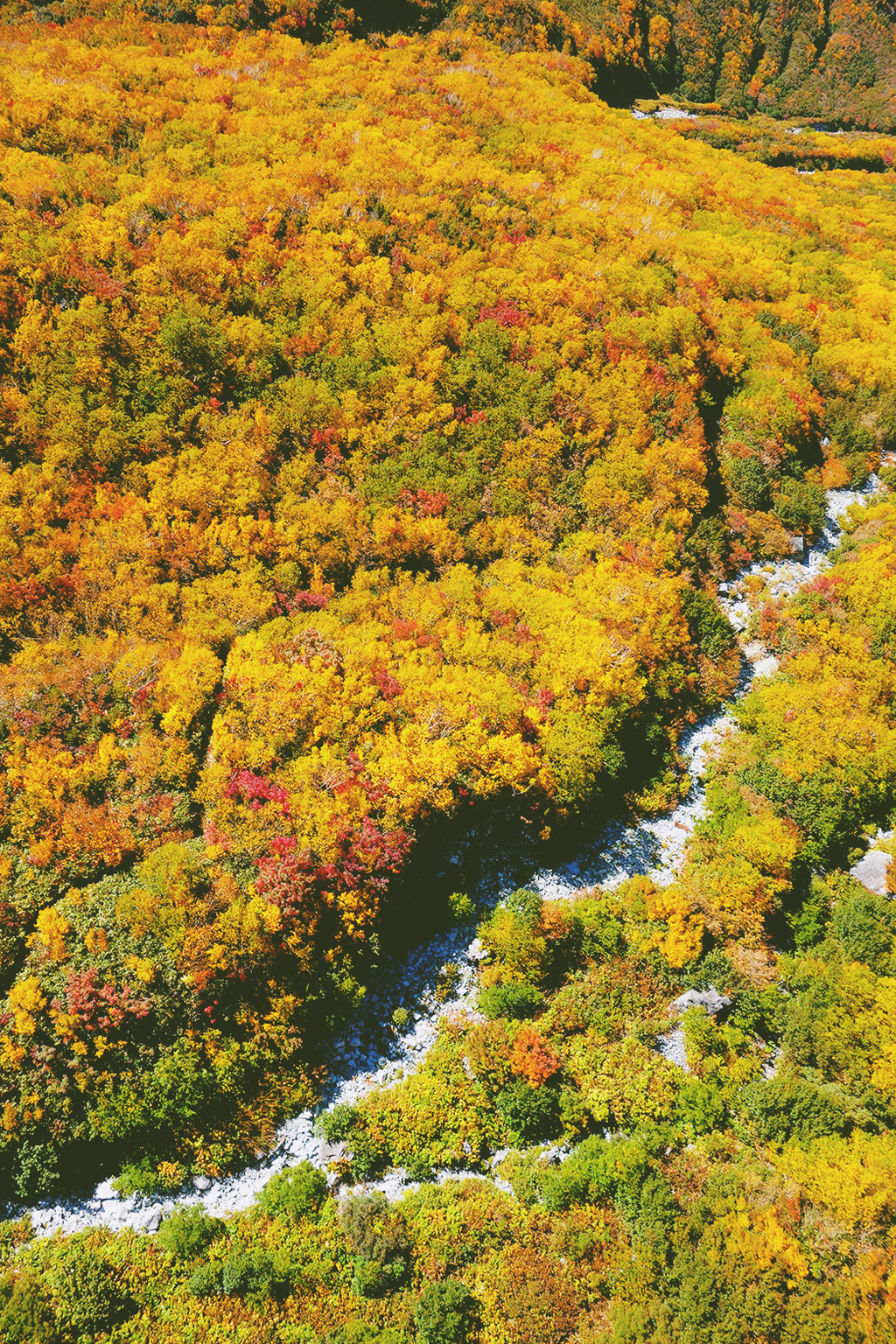紅葉の真上を進む。ものすごい光景に車内が湧いている。