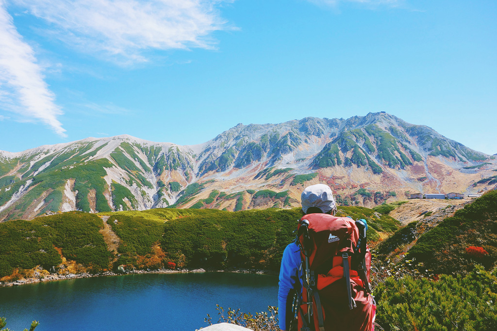 ミクリガ湖をバックにパシャリ。初めてのテン泊に加え、秋山への備えとしてダウンパンツなどの防寒具も入っているのでグレゴリーZ55がパンパンである。